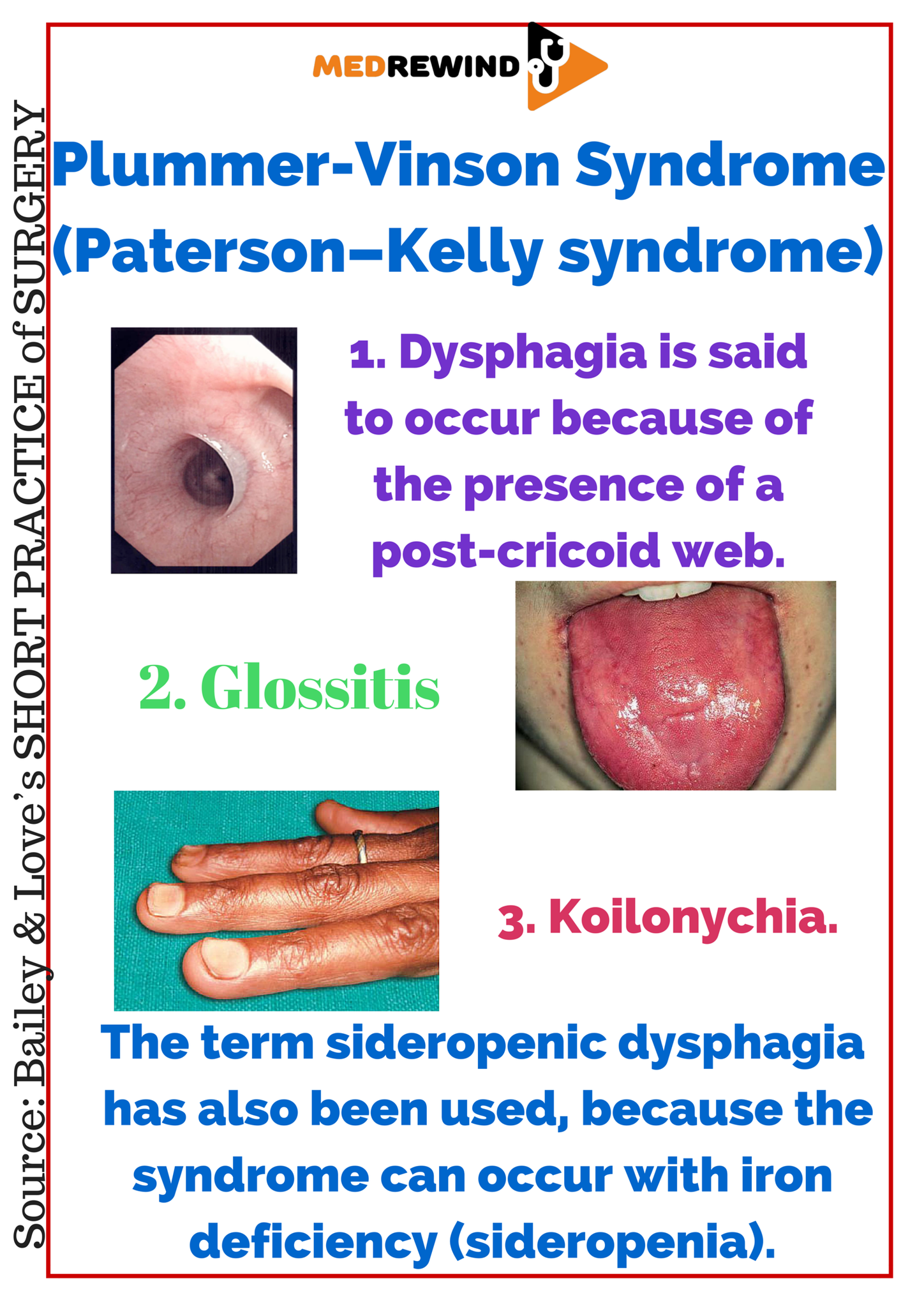 On exam she is pale and has spoon-shaped fingernails. Lucy Liu Orthobullets Team Orthobullets Team 0 Topic. Barrett esophagus and Plummer-Vinson syndrome. This is a syndrome occurring with chronic long term Iron deficiency anemia. Plummer-Vinson Syndrome Gastroesophageal Reflux Disease GERD Barrett Esophagus Hiatal Hernias Boerhaave Syndrome Mallory-Weiss Syndrome Esophageal Varices Esophagitis. This syndrome must be recognized early because it is a risk factor for squamous cell carcinoma of the esophagus. If youre preparing for the United States Medical Licensing Examination USMLE.