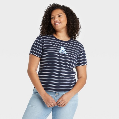 Womens Care Bears Embroidered Baby Doll Short Sleeve Graphic T-Shirt - Navy Blue Striped. 90s Striped Vintage Polo Jeans Company baby doll T-shirt top Size womens medium.